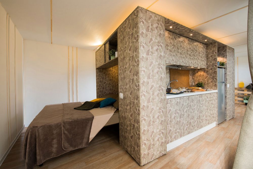 Maxi Caravan, moderna e dal design accattivante è l’ideale per famiglie e gruppi di amici. Sulla veranda esterna in legno potrete rilassarvi ammirando il lago nell’area relax.